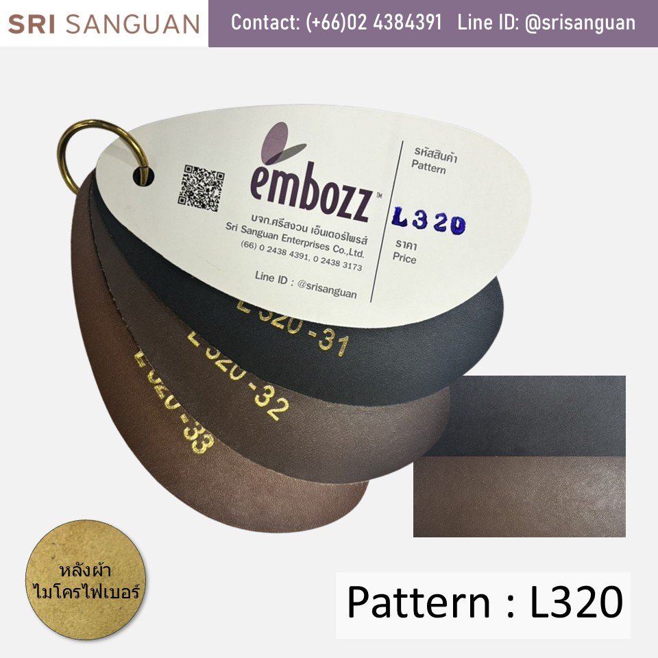 L320 is a 1.4mm thick PVC faux leather with a small pattern, smooth surface, and slight sheen. The microfiber backing is very similar to genuine leather and is durable. Available in three colors, it's ideal for bag straps and hard-shell bags that show the fabric backing.