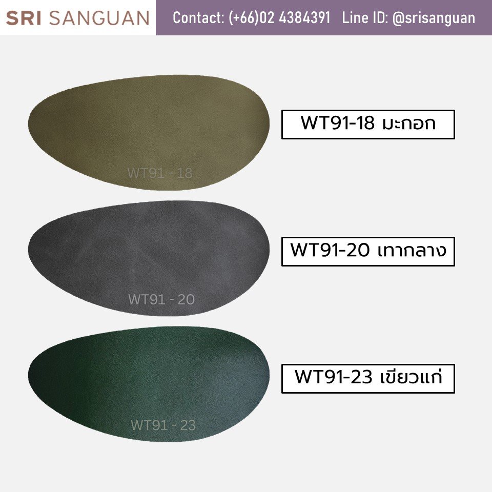 WT91 เป็นหนังเทียมผิวเรียบ แมท ลายเล็กด้วยเทคนิคสีทูโทน หลังผ้าขน หนา 1.0mm มีสีให้เลือกทั้งหมด 11สี เหมาะทั้งเฟอร์นิเจอร์ เบาะ กระเป๋าใหญ่ คุณสมบัติพิเศษ สามารถทนความร้อน/ความชื้น ทำความสะอาดง่าย หนังเป็นแบบเป็นมิตรต่อสิ่งแวดล้อม